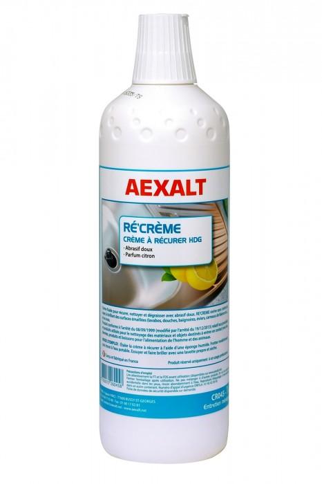 Aexalt Ré'Crème est un nettoyant et dégraissant avec abrasif naturel (à base de pierre de marbre) pour raviver sans crainte de rayer.  De composition fluide et douce pour toutes les surfaces : lavabos, inox (robinetterie, matériel de cuisine…), baignoires, douches, faïence. Facile à rincer grâce à sa fluidité. Conforme à l’arrêté du 8 septembre 1999 (modifié par l’arrêté du 19 décembre 2013) relatif aux procédés et produits utilisés pour le nettoyage des matériaux et objets destinés à entrer en contact avec des denrées, produits et boissons pour l’alimentation de l’homme et des animaux.