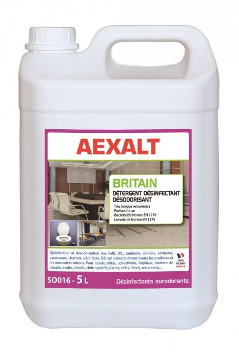 Le détergent désodorisant désinfectant bactéricide et fongicide Britain d'Aexalt : très longue rémanence spécialement étudié pour le nettoyage en milieu professionnel de tous types de sols et de surfaces lavables, y compris les sols protégés par une émulsion.