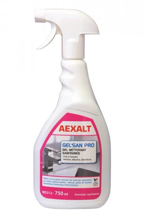 Aexalt Gel'San Pro nettoie, détartre et désinfecte les surfaces lavables telles que : les éléments des sanitaires (lavabos, douches, baignoires, urinoirs, abattants de cuvettes de wc, robinetteries), carrelages, plans de travail, surfaces modernes, les faïences murales. Gel'San Pro laisse une senteur agréable de fraîcheur et de propre après utilisation. Gel'San Pro est conforme à l’état pur à la norme bactéricide EN 1276, à 20°C, en conditions de saleté, à l’état pur, pour un temps de contact de 5 minutes.