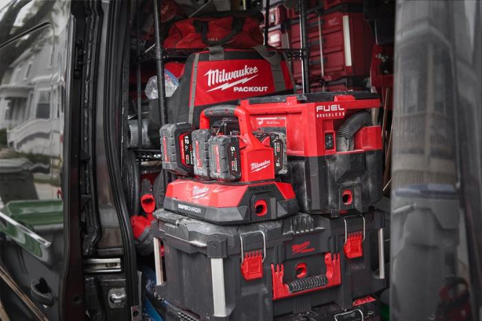 Chargeur rapide de la gamme PACKOUT™ Milwaukee®, compatible avec toutes les batteries M18™ et avec tous les produits de la gamme PACKOUT™, doté de six ports de charge, de multiples rangements et d'une poignée de transport pour pouvoir emmener vos batteries et vos outils partout avec vous.