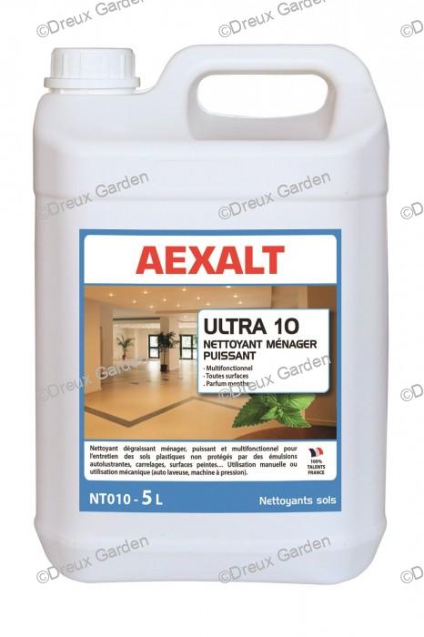 Aexalt Ultra 10 est un nettoyant dégraissant ménager multi-usages puissant. Nettoie, émulsionne et élimine radicalement les graisses, les huiles, les cires, les dépôts tenaces. Facile d’utilisation très peu moussant et économique il est conseillé pour l’entretien de toutes les surfaces lavables : meubles peints, murs, sanitaires, sols / carrelages,  surfaces peintes...